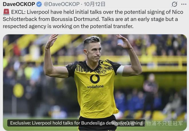 最近这一波传闻始于10月12日,利物浦网红博主“DaveOCKOP”发布号称独家消息:“利物浦已经与多特中卫施洛特贝克展开初步接触,且对话是积极的。”这个消息源看看就好,不必当真。