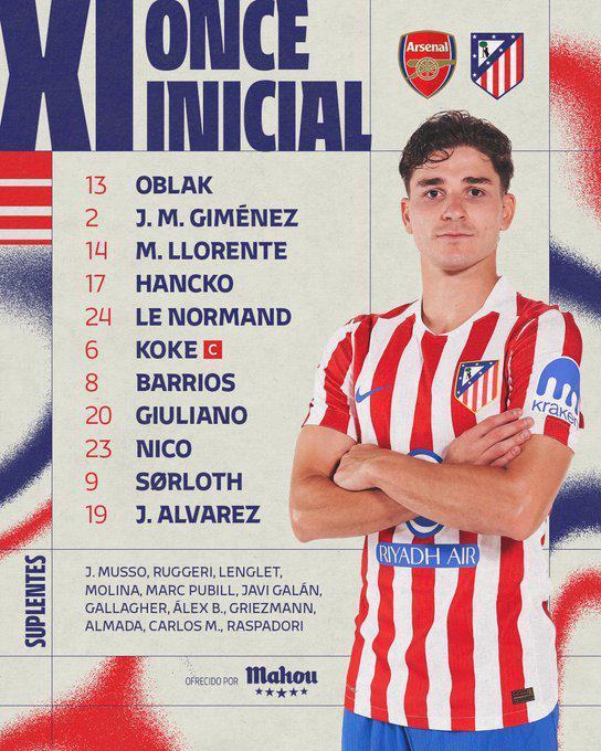 马竞首发:13-奥布拉克、2-希门尼斯、6-科克、8-巴里奥斯、9-索尔洛特、14-略伦特、17-汉茨科、19-阿尔瓦雷斯、20-西蒙尼、23-尼科·冈萨雷斯、24-勒诺尔芒